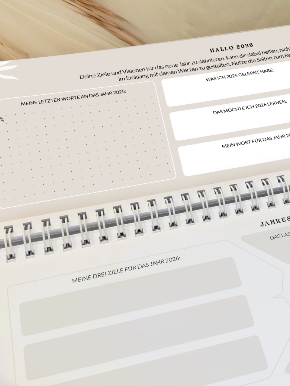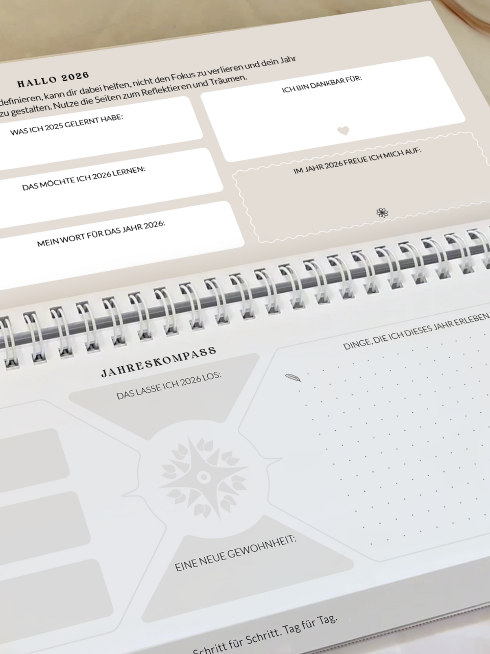 • Nützliche Zusatzseiten wie Kontakte, Urlaubsplanung, Jahresübersicht,  Schulferien, Jahresziele und Produktivitätstipps